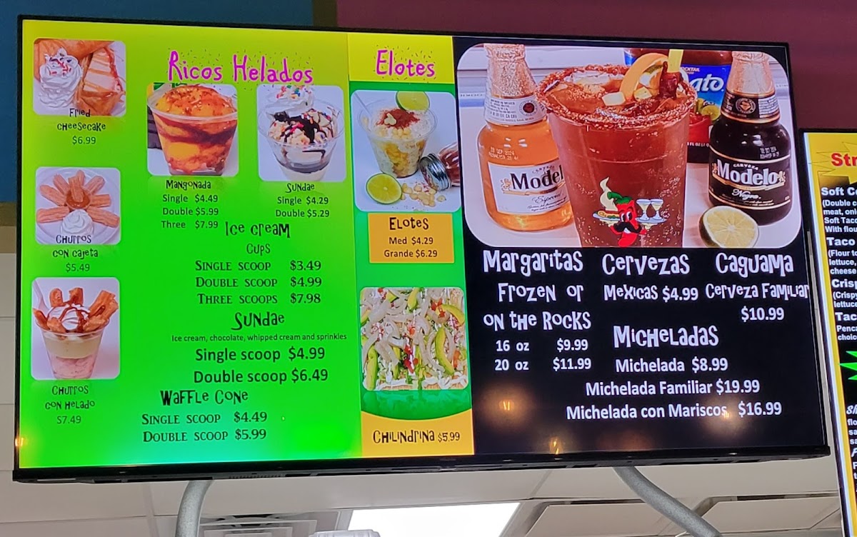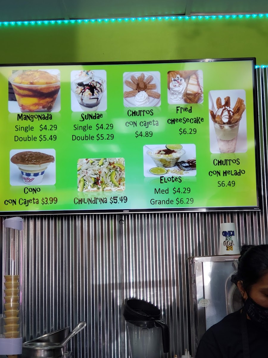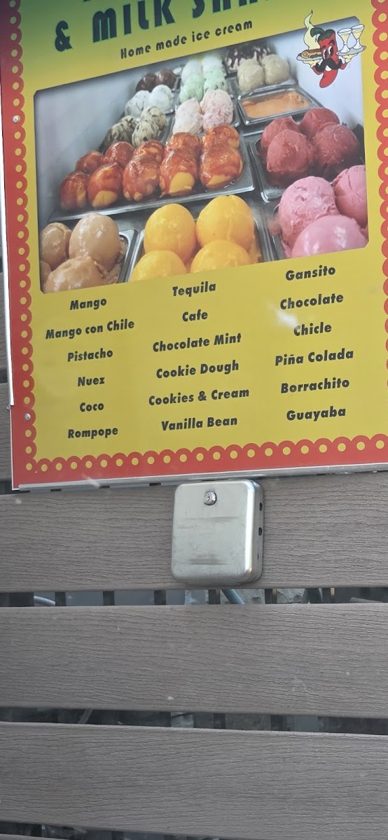 Choice of ice cream flavor: mango, mango con chile, pistachio, nuez, coco, rompope, tequila, cafe, chocolate mint, cookie dough, cookies & cream, vanilla bean, ganzito, chocolate, or chicle.